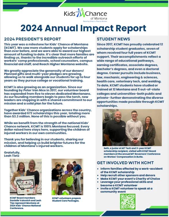 Kids’ Chance of Montana is an IRS approved nonprofit 501(c)(3) tax-exempt organization founded in 2017 by professionals working in the workers' compensation industry in Montana. KCMT is managed by an all-volunteer board. We raise funds for scholarships through donations from individuals, corporations, and other organizations, some active in workers' compensation industry and many others simply supporting of our mission to help kids impacted by workplace injuries and deaths. The founders, board members and supporters of Kids’ Chance of Montana believe that we are making significant differences in the lives of our supported children by assisting with financing a portion of their post-K-12 educational experiences.