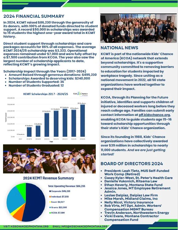 Kids’ Chance of Montana grew from these strong roots and formed as an IRS Approved 501(c)(3) in 2017. Our mission is to provide education assistance / scholarships to children of Montana workers who have been severely injured or killed on the job. Since 2017, Kids’ Chance of Montana has awarded scholarships to 43 kids totaling over $300,000 to pay tuition, fees and other necessary costs on behalf of our students to attend colleges, technical schools, or vocational training of their choice.