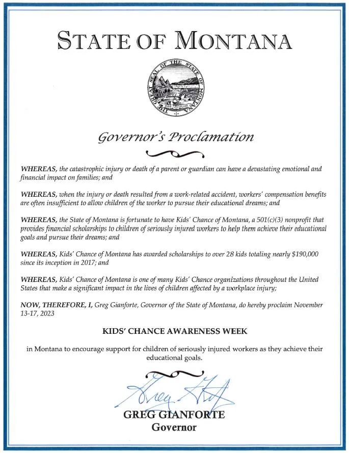 Leah Tietz, a founding Board member and current President of Kids' Chance of Montana, has announced that Montana Governor Gianforte has declared November 13 - 17, 2023 as Kids' Chance Awareness Week.